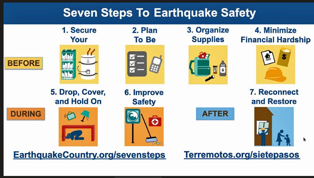 The Great California ShakeOut is an annual opportunity to practice how to be safer during big earthquakes: “Drop, Cover and Hold On.” The ShakeOut has also been organized to encourage you, your community, your school, or your organization to review and update emergency preparedness plans and supplies, and to secure your space in order to prevent damage and injuries.